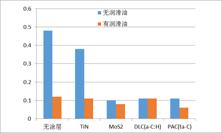 市售車中,在強化燃效、排氣限制的同時,從1990年代后半期,開始探討利用DLC的低摩擦的低燃效化。以降低燃效為目的的DLC研究中,對發(fā)動機機油環(huán)境下的各種涂層進行了評估,如圖1所示,DLC中PAC具有非常低的摩擦系數(shù),與鉆石相當。據(jù)推測,這是因為PAC表面容易與機油中的羥基等結(jié)合,與其他涂層相比,機油潤滑層的保持力較高。另外,在隨后的研究中,發(fā)現(xiàn)了發(fā)動機機油中的Mo-DTC和DLC(a-C:H)會相互作用,從而導致了異常磨損。這是由于Mo-DTC+MoO3→MoS2反應進化過程中DLC膜中的氫參與反應被釋放了,從而膜產(chǎn)生石墨化(硬度下降)和膜的密度下降(脆化,結(jié)合力下降),PAC膜層中沒有氫,推測不發(fā)生這種反應,發(fā)動機機油和PAC配合的耐磨性使得PAC作為發(fā)動機零部件的表面處理一躍成為矚目涂層。
